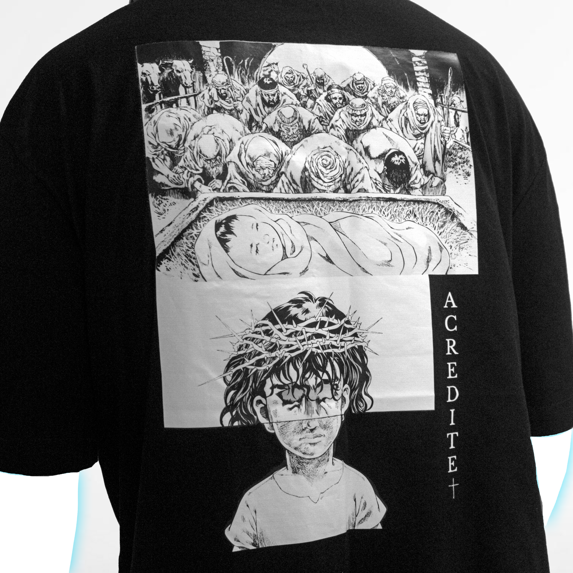 Na parte da frente, a arte une a profecia com a imagem de Cristo coroado de espinhos, mostrando a grandeza que não veio pelo poder terreno, mas pelo sacrifício. Nas costas, o contraste é ainda mais marcante: o nascimento humilde na manjedoura, adorado pelos pastores, se conecta ao destino do Redentor, já apontado desde a infância.